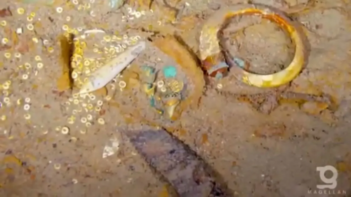 Las imágenes del escáner muestran un collar de oro con un diente de megalodón, conocido científicamente como Otodus megalodon, un tiburón prehistórico que vivió hace más de 23 millones de años.