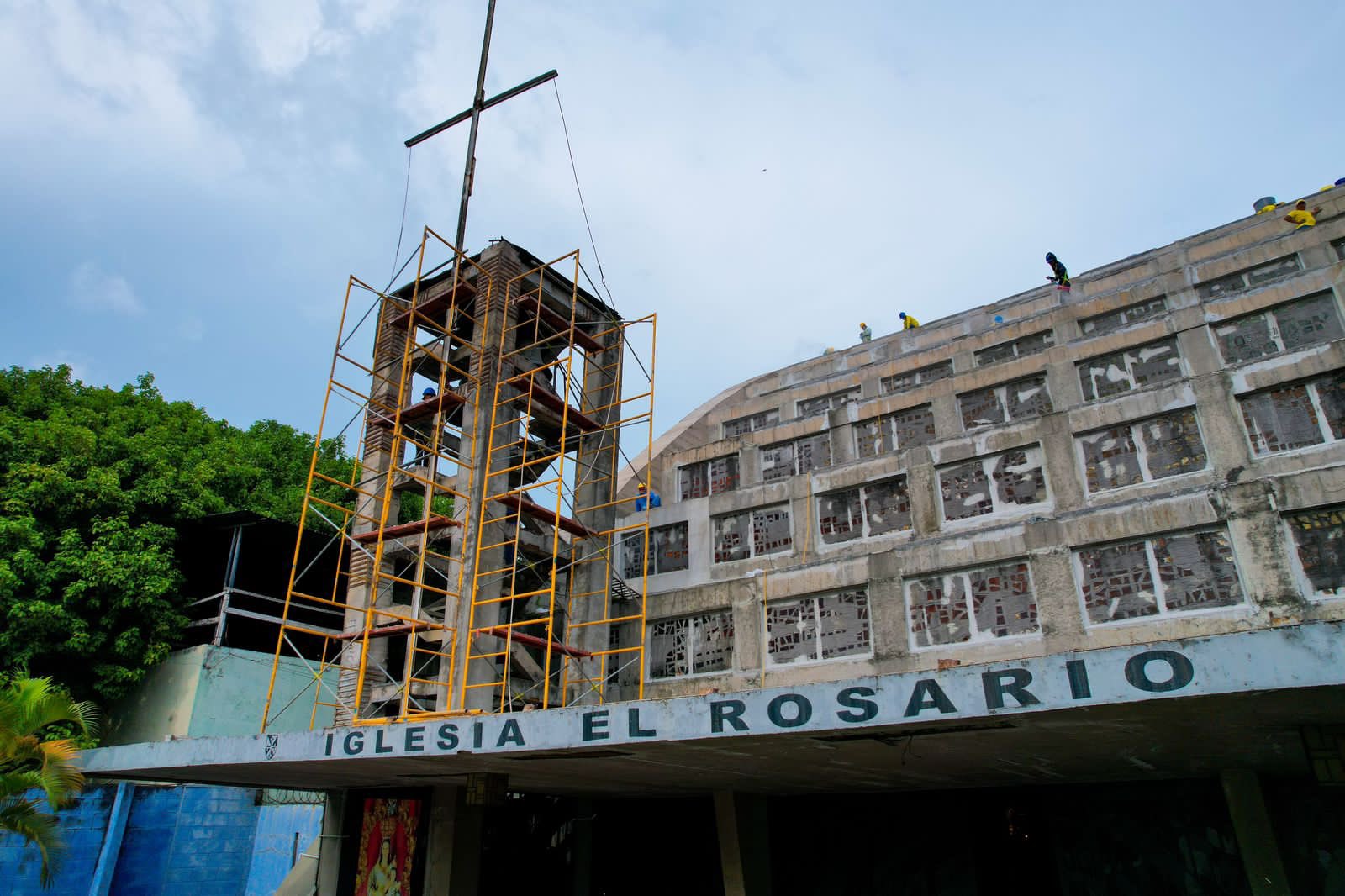 El Ministerio de Obras Públicas (MOP) realiza mantenimiento a la Iglesia El Rosario en el Centro histórico de San Salvador, realizando limpieza tanto limpieza de techo como a la infraestructura, colocando iluminarias y resanar paredes.