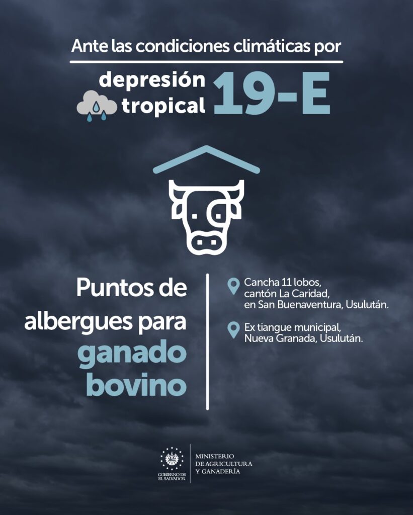 Habilitando albergues también en Ex tiangue municipal Nueva Granada, Usuluán, Cancha de futbol de las instalaciones del distrito de las Tunas, Conchagua, La Unión (animales de corral), Campo de la Universidad de El Salvador Pasaquina, La Unión.