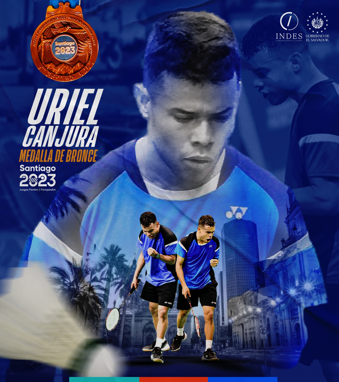 El Salvador aseguro su primera medalla en los Juegos Panamericanos en Santiago 2023 Chile, el badmintonista Uriel Canjura del Programa Esfuerzo y Gloria venció al norteamericanos Howard Shu, ganando la medalla de bronce para El Salvador.