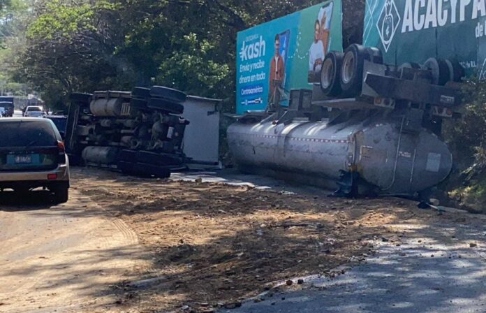 La Policía Nacional Civil (PNC) reportó sobre un accidente de tránsito donde un cabezal que trasportaba aceite volcó en el kilómetro 86 y medio de la carretera Troncal del Note, La Palma, Chalatenango.