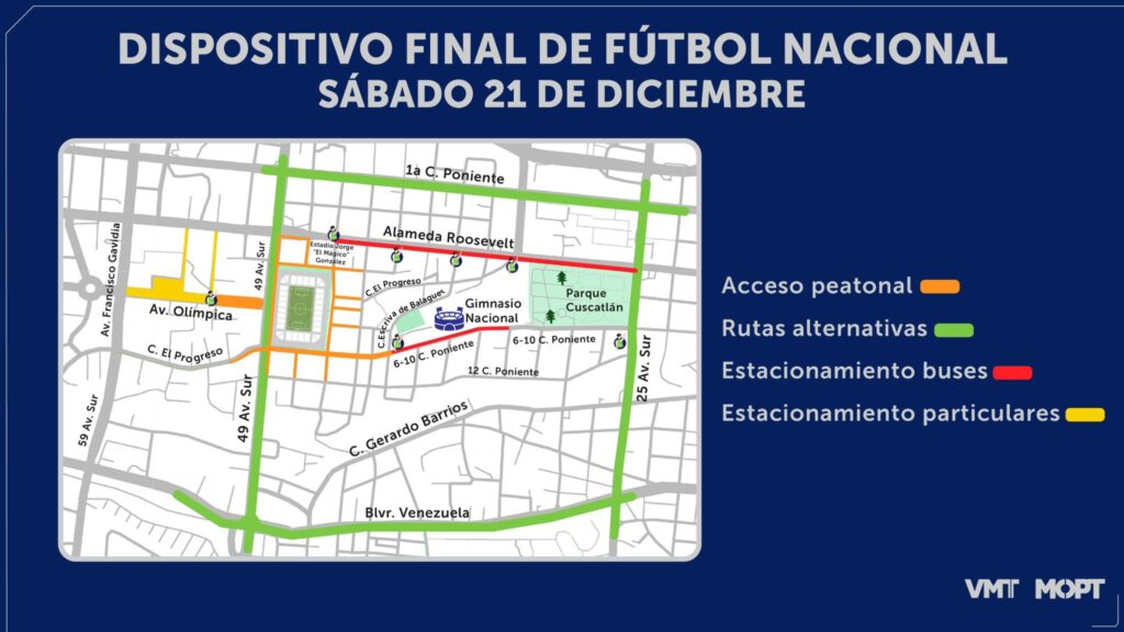 A partir de las 2:00 p.m. los cierres se extenderán hacia la zona Oriente del estadio, en la 6-10 c. Poniente y en un carril de la Alameda Roosevelt, así como todas las calles internas de la colonia Flor Blanca, el Boulevard Venezuela, la 25 av. Sur y demás vías de la periferia estará habilitadas como rutas alternativas a la circulación. “Este dispositivo ha sido diseñado entre diferentes instituciones del Estado. A partir de las 6:00 a.m. del sábado 21 de diciembre realizaremos cierres en las calles del perímetro del estadio Jorge “El Mágico” González porque estará destinada a la movilidad peatonal”, menciono el director Felix Eduardo Serrano.