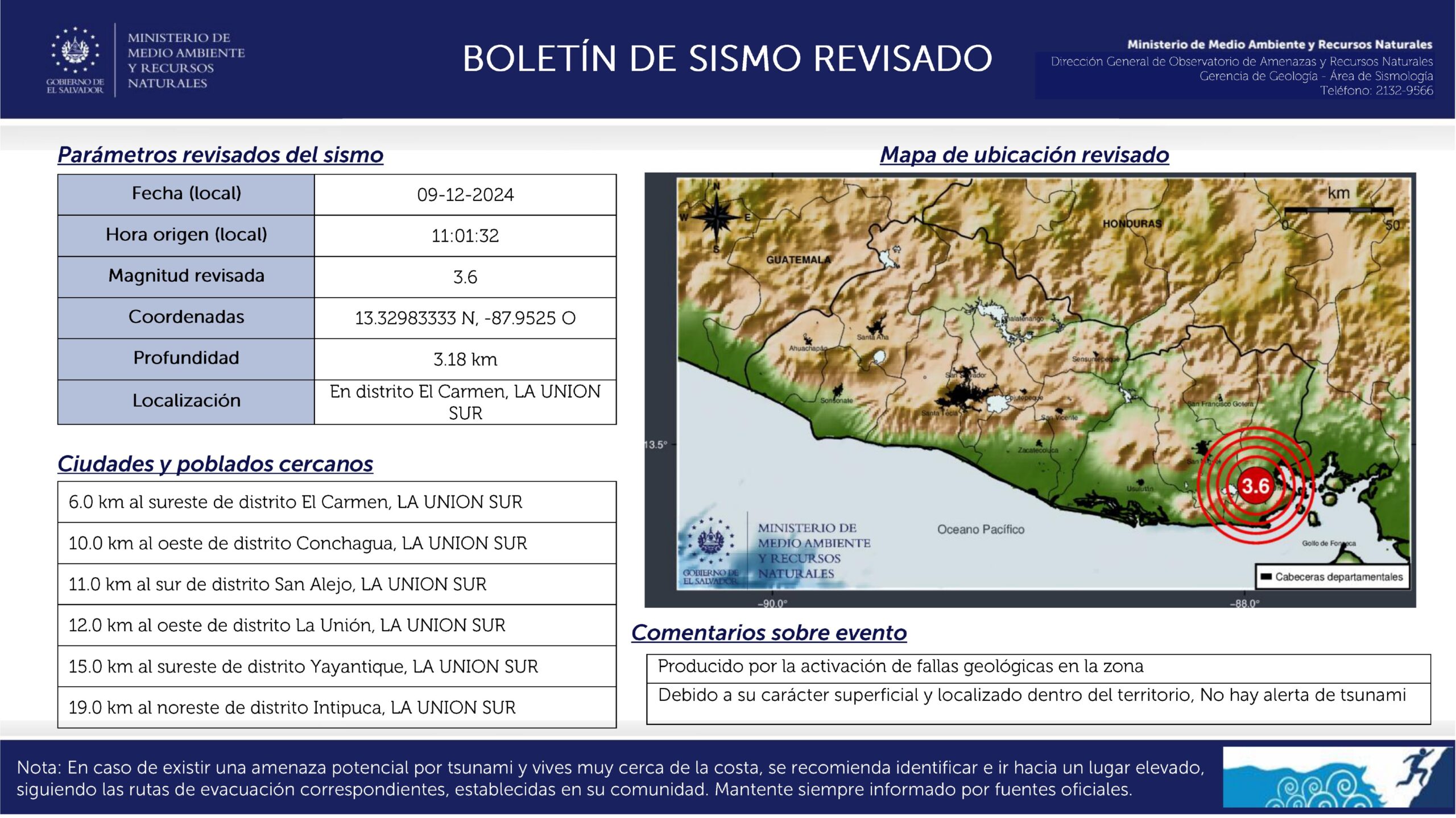 Las autoridades destacaron que el sismo inicial fue de 5.8, en el distrito de Conchagua, La Unión Sur, lo que generó 177 réplicas tras la ocurrencia del sismo de magnitud 5.8 a la 9:50 p.m. del 8 de diciembre y hasta las 11:00 a.m. del 9 de diciembre; han ocurrido 202 réplicas, de las cuales 72 han sido sentidas por la población de la zona, estos temblores habrían sido originados por la activación de fallas geológicas de la zona, según Medio Ambiente han sido superficiales.