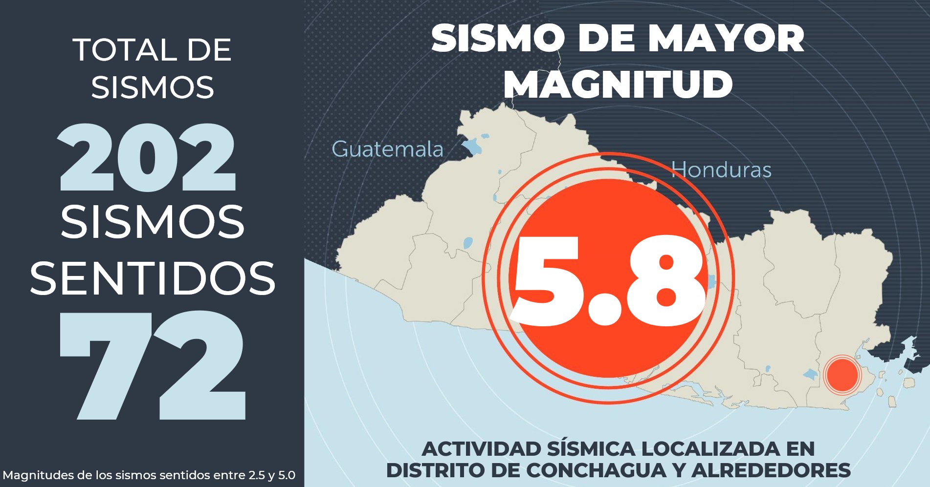 Las autoridades destacaron que el sismo inicial fue de 5.8, en el distrito de Conchagua, La Unión Sur, lo que generó 177 réplicas tras la ocurrencia del sismo de magnitud 5.8 a la 9:50 p.m. del 8 de diciembre y hasta las 11:00 a.m. del 9 de diciembre; han ocurrido 202 réplicas, de las cuales 72 han sido sentidas por la población de la zona, estos temblores habrían sido originados por la activación de fallas geológicas de la zona, según Medio Ambiente han sido superficiales.