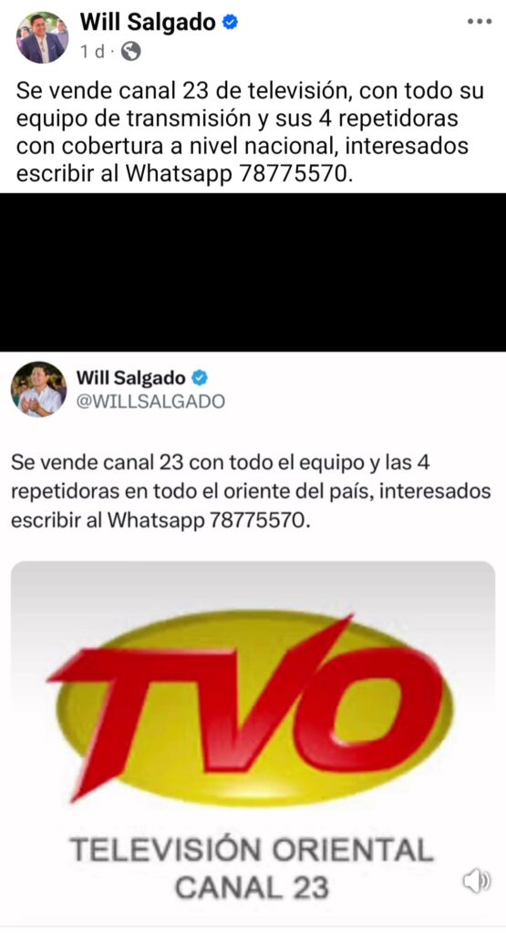 «Se vende canal 23 de televisión, con todo su equipo de transmisión y sus 4 repetidoras con cobertura a nivel nacional, interesados escribir al Whatsapp 78775570», posteo Will Salgado en sus redes sociales, detalló que la venta del canal incluye todo el equipo de producción y las cuatro repetidoras en la zona oriental, pero no el local donde actualmente opera, aunque estaría dispuesto a alquilarlo si el comprador lo requiere.