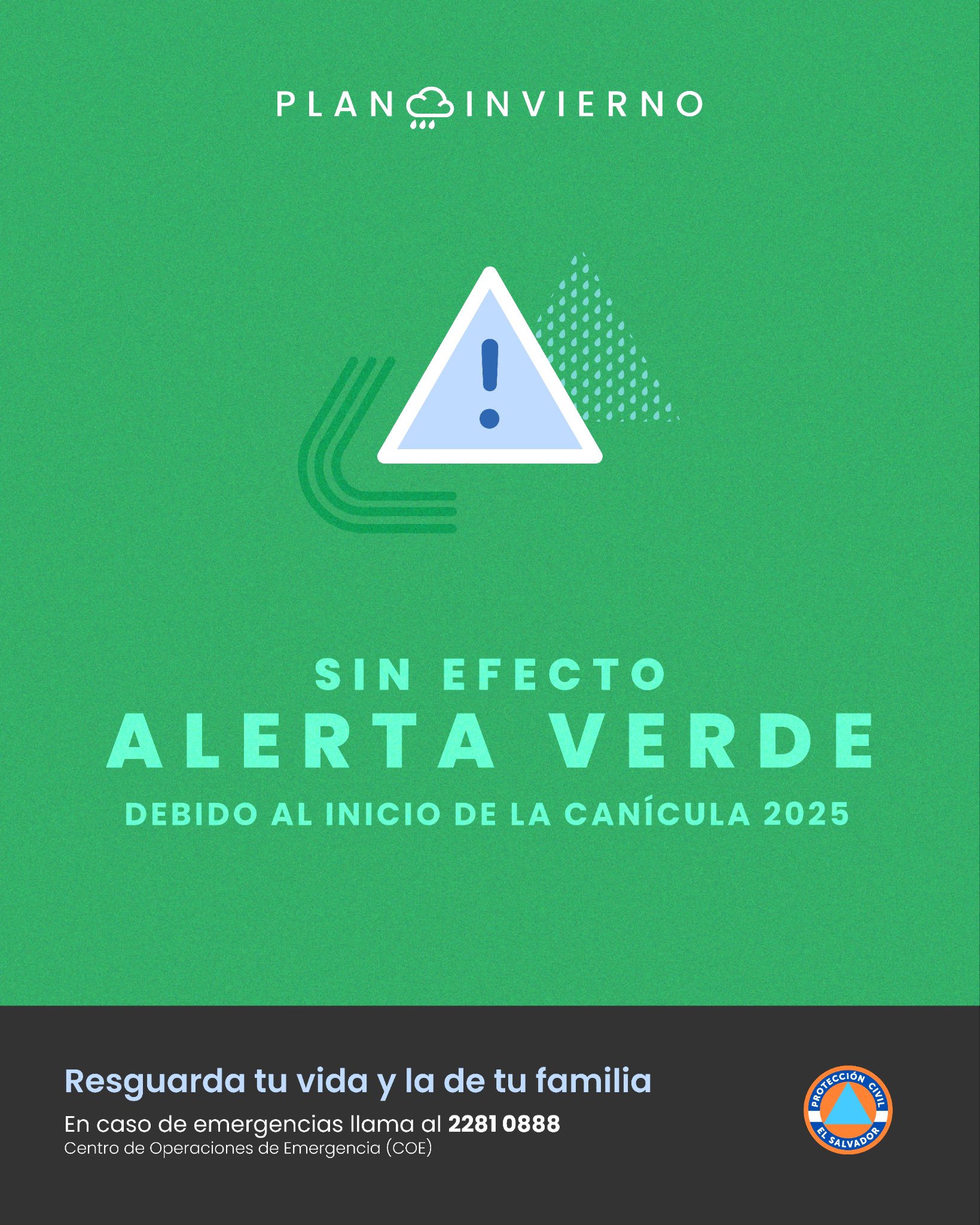Esta alerta se deja sin efecto, basado en el Boletín número 2 publicado este martes 15 de julio de 2025 por la Dirección General de Observatorio de Amenazas y Recursos Naturales, dado que a la fecha y con base al análisis del comportamiento de variables meteorológicas como la lluvia diaria y la temperatura, así como del estado actual de la atmósfera sobre la región centroamericana y El Salvador, se puede afirmar que la canícula ha dado inicio.