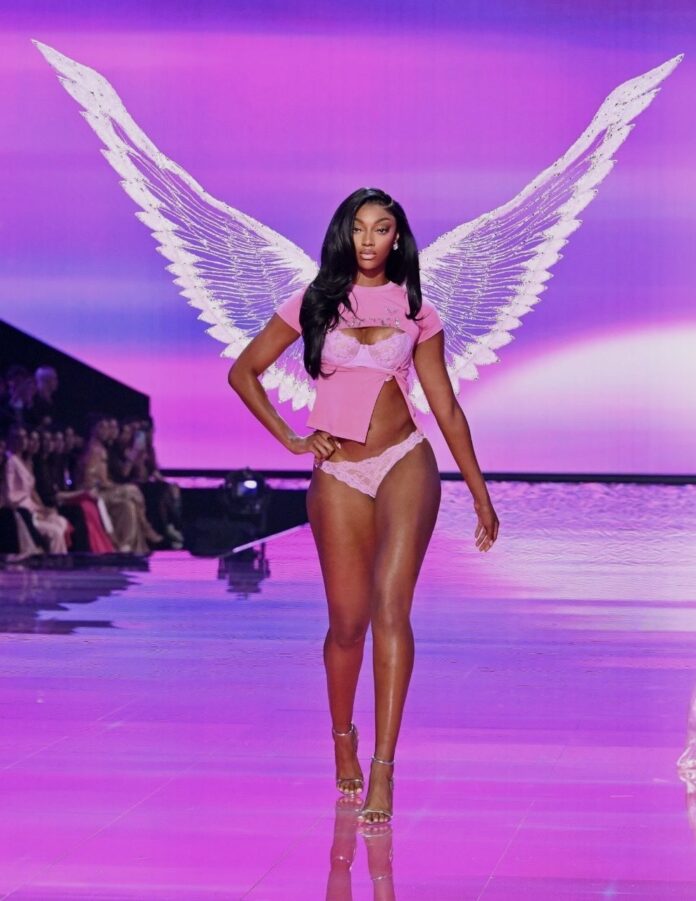 Reese, de 1,90 metros de estatura, lució las icónicas alas blancas de ángel que han definido el espectáculo durante décadas, un nuevo escenario para una deportista conocida por su confianza, carisma y atractivo. Caminó al ritmo de “Never Leave You (Uh Oooh, Uh Oooh)” de Lumidee.