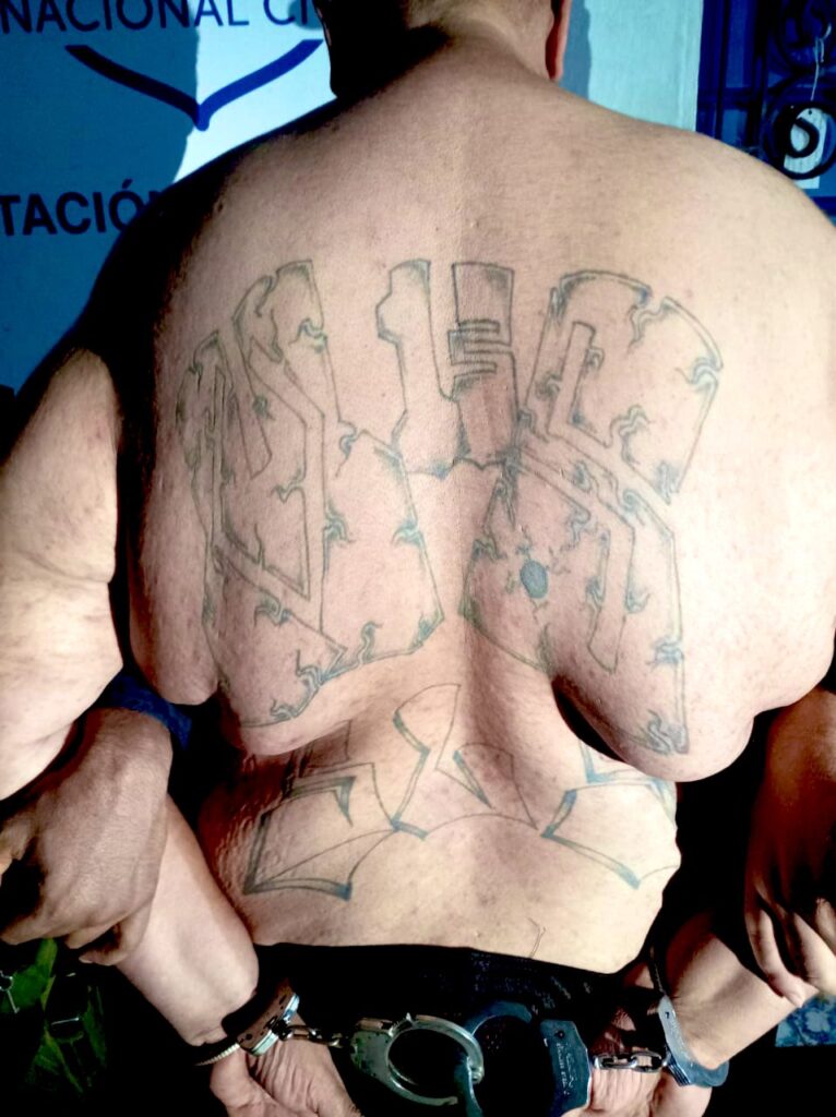 Junto a elementos de la Fuerza Armada la PNC capturo en Mizata, La Libertad Costa, a Reynaldo Alexander Córdoba Ramos, alias Patriarca, presunto gatillero de la MS13. Tiene los tatuajes de su pandilla en la espalda.