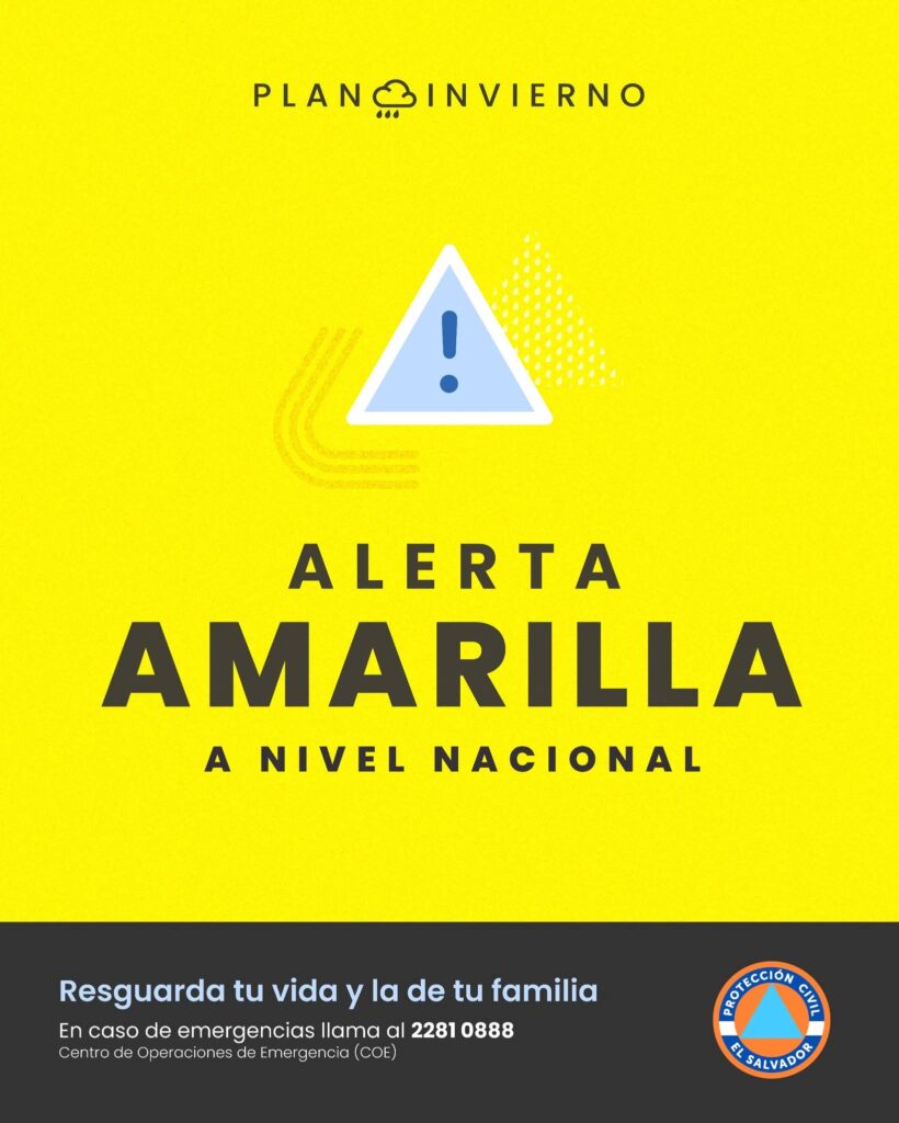 La Dirección General de Protección Civil, de acuerdo al Inciso 2 del Artículo 58 del Reglamento General de la Ley de Protección Civil, Prevención y Mitigación de Desastres, deja sin efecto la ALERTA NARANJA POR ACERCAMIENTO DE ZONA DE CONVERGENCIA INTERTROPICAL Y BAJA PRESIÓN EN EL OCÉANO PACÍFICO, publicada el pasado 13 de octubre del presente año, a su vez, emite ALERTA AMARILLA EN TODO EL TERRITORIO NACIONAL; debido a que las lluvias se mantienen en el país.