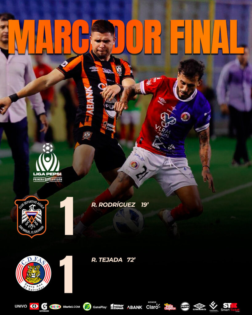 En la segunda parte Club Deportivo FAS coemnzo adelantar sus líneas y cada vez tomaba el ritmo del juego para superar las líneas defensivas de Águila, tras una gran jugada Rafael Tejada anoto el 1-1 al minuto 72′, tras el gol FAS comenzó a llegar más al área rival para buscar el gol de la victoria pero Águila se defendía muy bien, el partido finalizaria con un amargo 1-1 para ambos equipos.