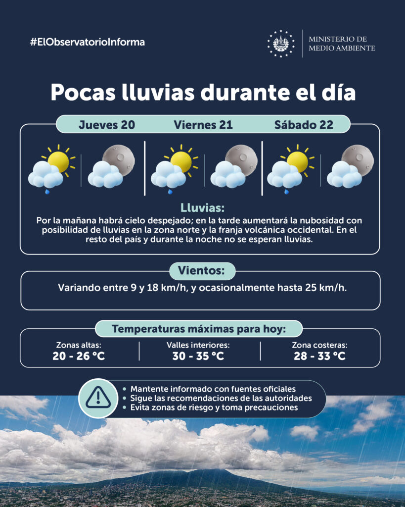 En la mañana el cielo estará despejado pero, apartir de la tarde, aumentará la nubosidad, con posibilidad de lluvias en la cadena montañosa norte y la franja volcánica del occidente. Durante la noche, no se esperan lluvias y el ambiente será más fresco.