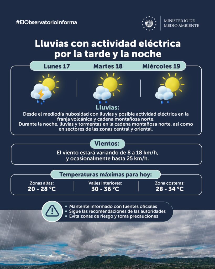 Las autoridades reportan que se esperan lluvias con actividad eléctrica por la tarde y noche, especialmente en la franja volcánica, cadena montañosa norte y sectores de la zona central y oriental.