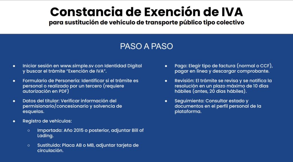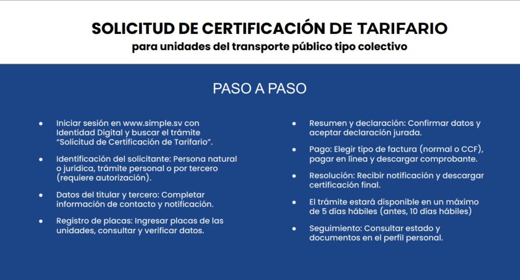 El titular del VMT Nelson Reyes mencionó que a través de la plataforma de simple.sv ya se puede realizar el registro de carga nacional e internacional, modificación física del vehículo de transporte de carga, autorización de realización de emisión de gases (para reintegro de vehículo al sistema), permiso especial para el transporte de materiales peligrosos.