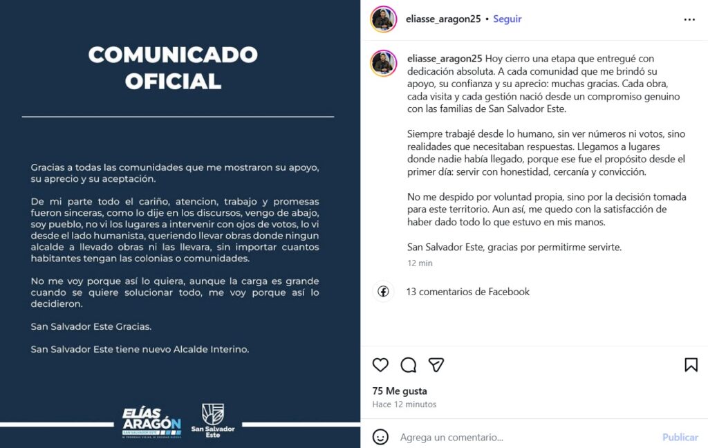 Una bomba política cayo en el municipio de San Salvador Este). El hasta ahora alcalde interino. Elias Aragon, difundió un comunicado en el que anuncia que abandona la alcaldía “no por voluntad propia”.