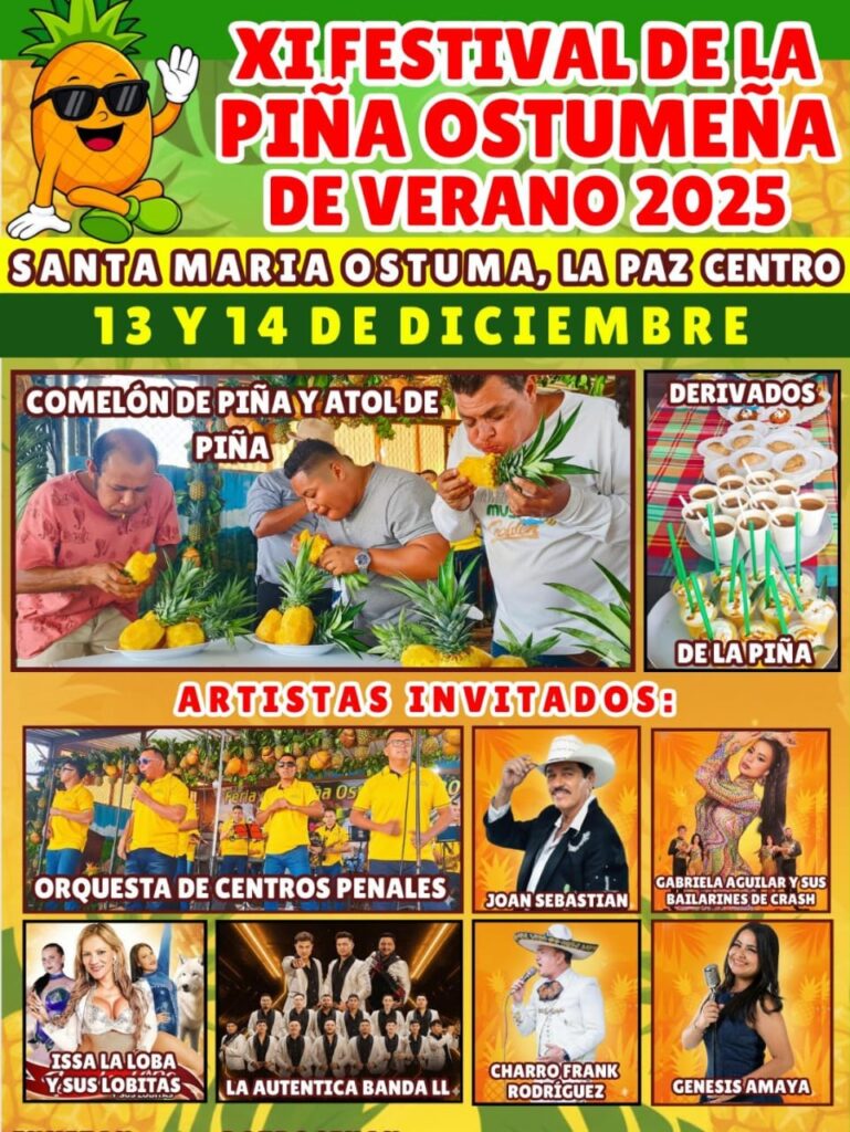 Se anuncia el «XI Festival de la Piña Ostumeña de verano 2025», en el distrito de Santa María Ostuma en La Paz Centro.
