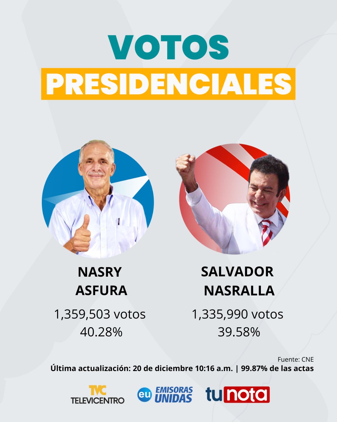 Con el 99,87 % de las actas escrutadas, Asfura lidera los resultados con el 40,28 % de los votos, contra el 39,58 % de Salvador Nasralla, del Partido Liberal, también conservador, mientras que la candidata del gobernante del Partido Libertad y Refundación (Libre, izquierda), Rixi Moncada, es tercera con 19,13 %, luego de que el jueves se reinició el conteo especial de votos con 2.792 actas electorales con inconsistencias.