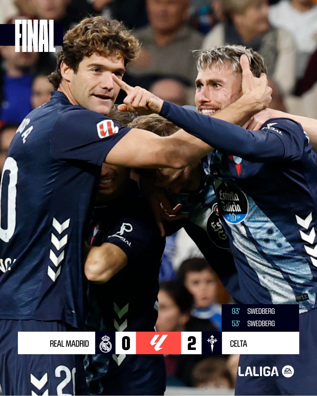 Sin embargo, Williot Swedberg certificó la victoria del Celta en el minuto 93, con un Real Madrid batido en el que, instantes antes, Álvaro Carreras se marchó expulsado tras ver dos cartulinas amarillas de forma consecutiva por protestar al colegiado Alejandro Quintero González.