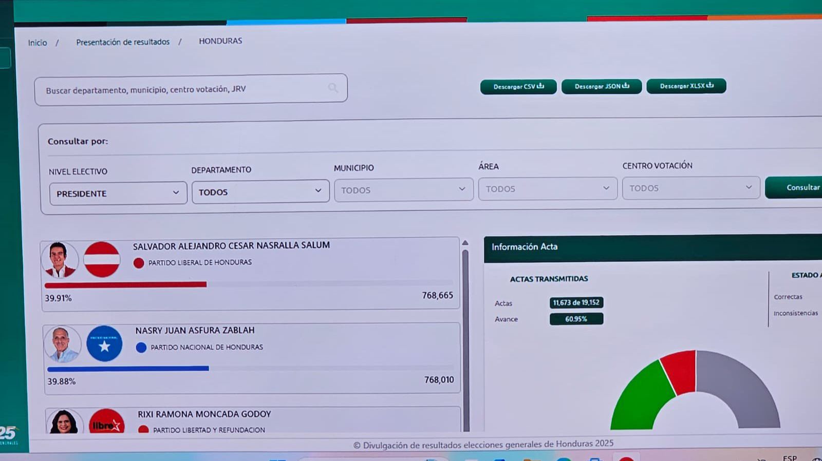 El CNE mostró en pantalla que Nary «Tito» Asfura del Partido Nacional, del Partido Nacional, cuenta con 749.022 votos (39,91 %), frente a los 748.507 sufragios (39,89 %) de Salvador Nasralla, del Partido Liberal, con el 57,03 % del conteo, los mismos resultados preliminares que el último corte disponible.