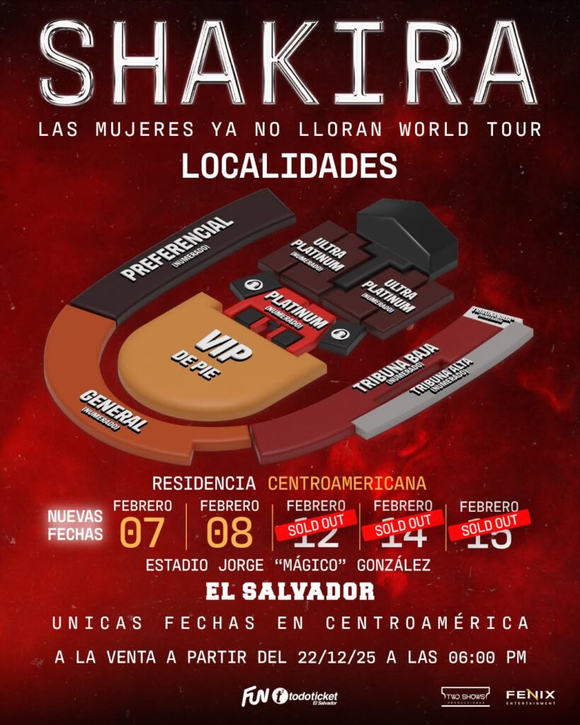 Shakira tendrá 5 conciertos en El Salvador, aunque solo se habiam anunciado 3 fechas la cantante anunció en sus redes sociales que habilitó dos fechas más para el tor «Las Mujeres Ya No Lloran «.