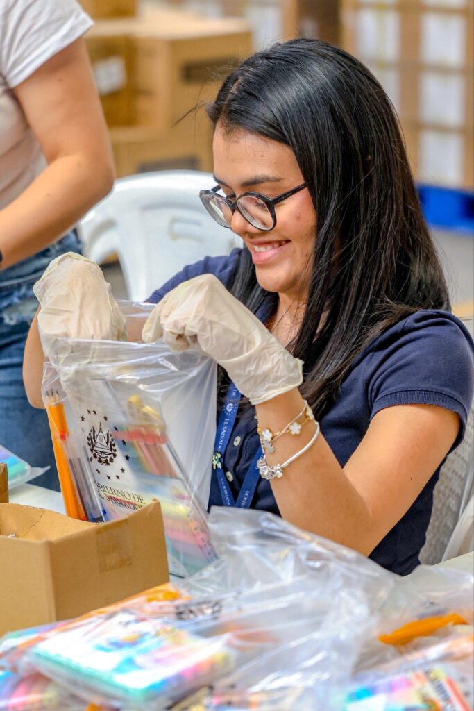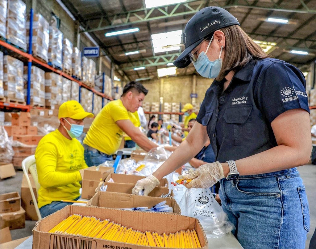 “Estamos dando cumplimiento a la orden del Presidente Nayib Bukele y a esta iniciativa de la Primera Dama Gabriela de Bukele, de entregar los paquetes escolares”, destacó que solo en una de las bodegas de la Aduana Terrestre San Bartolo se cuenta con aproximadamente 1,200 personas trabajando para entregar este insumo ampliado y mejorado.