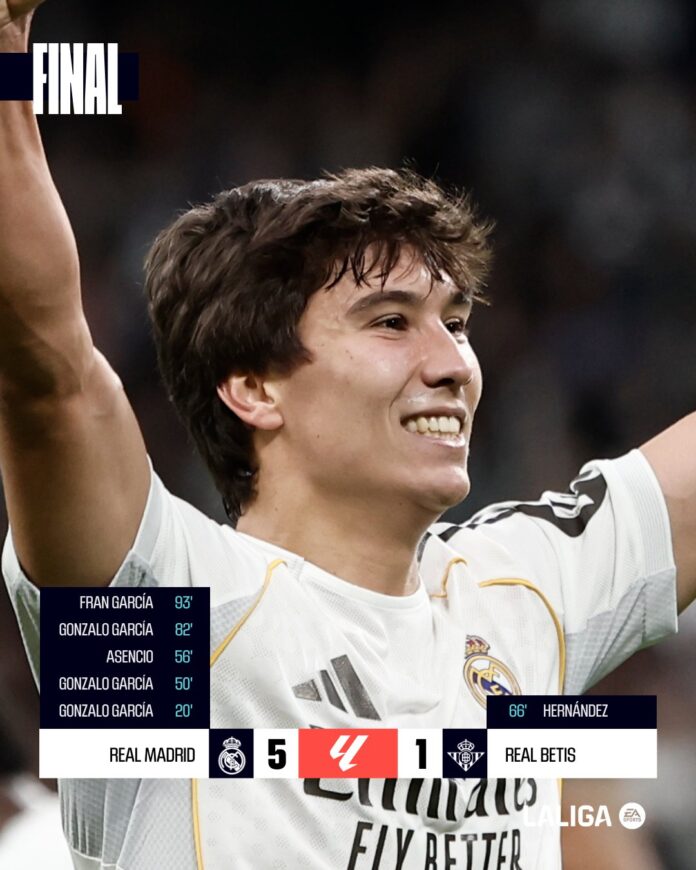 Un triplete en el día soñado de Gonzalo García, representando el anhelo de cualquier canterano que disfruta del partido de su vida en el Santiago Bernabéu, impulsó a un Real Madrid guiado en el arranque por Vinícius ante la ausencia de Kylian Mbappé, con una goleada balsámica previa a la Supercopa de España a un Real Betis que se conectó tarde al partido.
