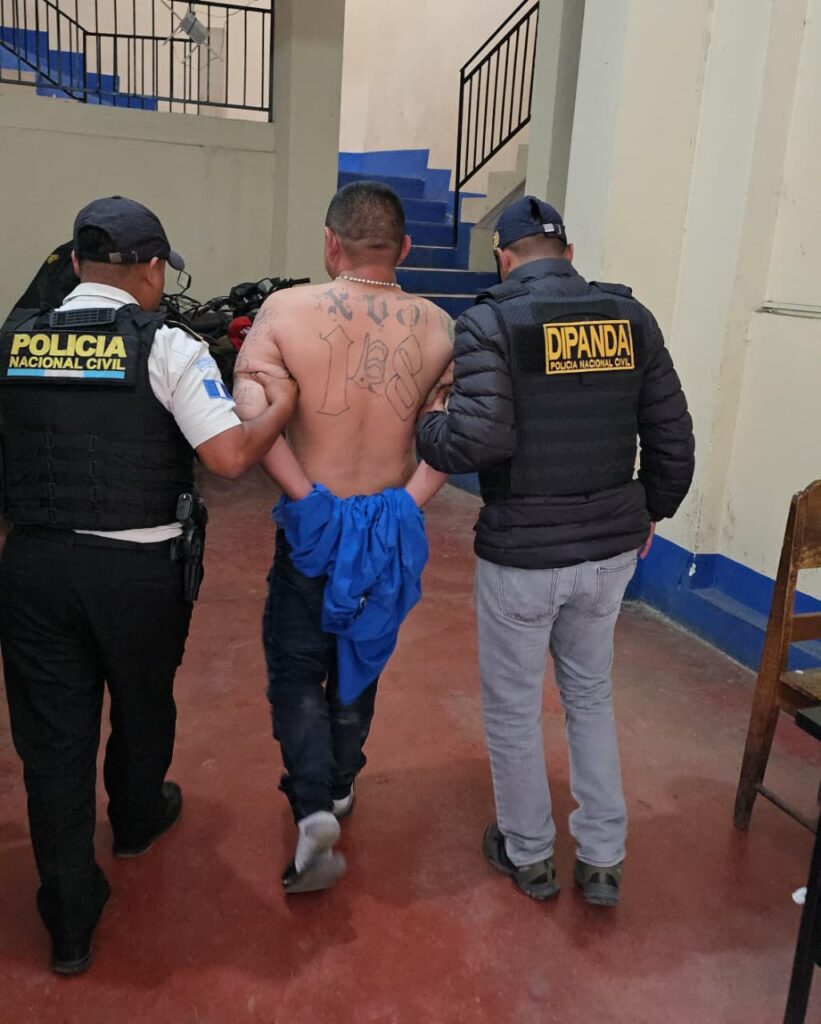El detenido es: Alexis Soto Gutiérrez, de 47 años, alias “El Snoopy”, Hommie brincado de la clica “solo para locos” de la mara 18, quien presuntamente montaba vigilancia para posteriormente perpetrar un ataque contra la PNC, extremo que se investiga. Sus tatuajes lo delatan como miembro de la referida mara.