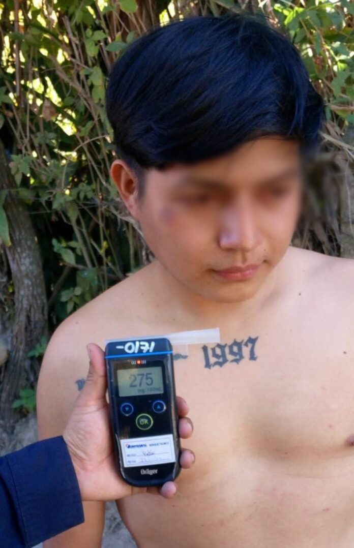 Aparentemente este sujeto provocó un accidente de tránsito con daños materiales sobre la calle principal de la colonia Vista al Lago, mientras conducía una motocicleta con 275° de alcohol.