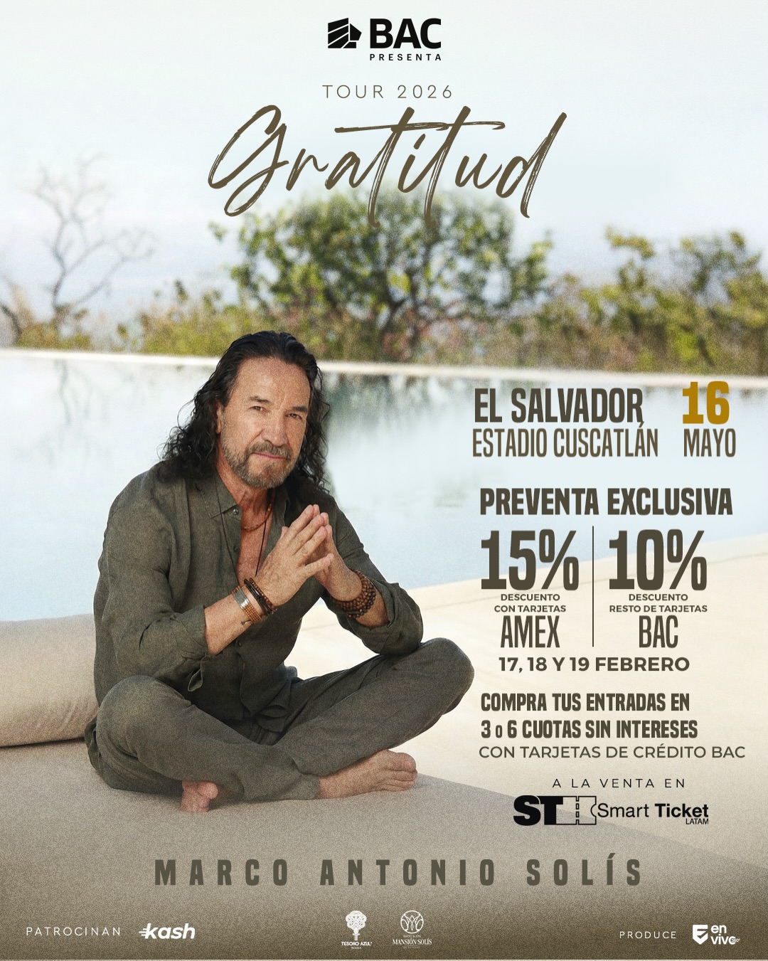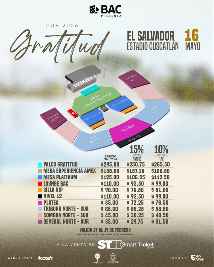 La preventa estará disponible este 17, 18 y 19 de febrero, con descuentos exclusivos y la opción de pagar en 3 y 6 cuotas sin intereses utilizando tarjetas de crédito y débito BAC Credomatic El Salvador, informó la productora En Vivo Producciones