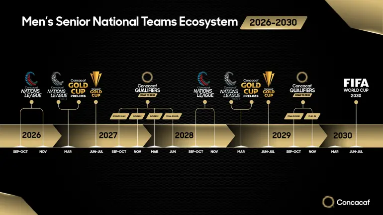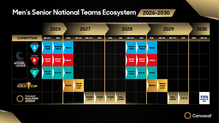 Concacaf ha anunciado el calendario para las competiciones de selecciones nacionales masculinas de la Confederación que se disputarán del 2026 al 2030. El ciclo de cuatro años entre Copas Mundiales contará con múltiples ediciones de la Liga de Naciones Concacaf y la Copa Oro Concacaf, además de un formato renovado para las clasificatorias para la Copa Mundial de la FIFA.