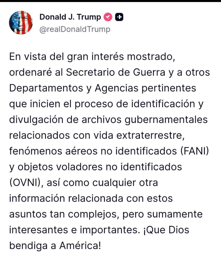 “Estoy ordenando la divulgación de archivos relacionados con la vida alienígena y extraterrestre, los fenómenos aéreos no identificados (UAP) y los objetos voladores no identificados (OVNI), y cualquier otra información relacionada con estos asuntos tan complejos, pero extremadamente interesantes e importantes”, escribió Trump.