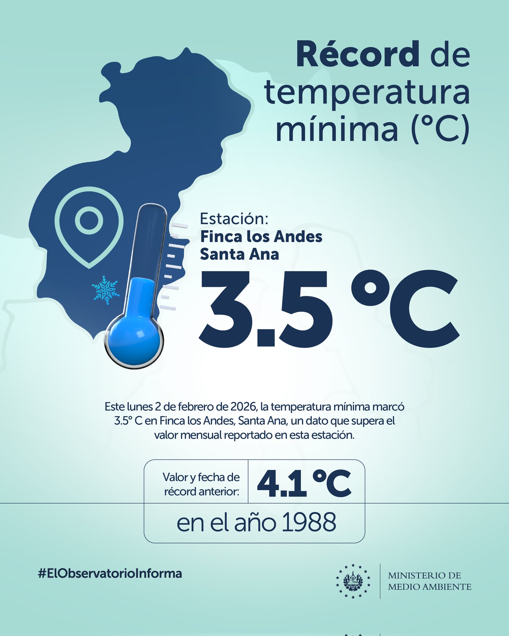 El Ministerio de Medio Ambiente y Recursos Naturales (MARN), reporto un hecho histórico al marcar un nuevo récord de temperatura mínima en Finca Los Andes, Santa Ana.