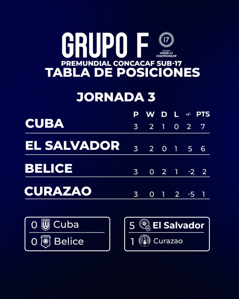 Con este resultado, El Salvador finalizó en la segunda posición del grupo con 6 puntos, a uno del líder Cuba, que sumó 7. Curazao cerró con 1 punto y Belice con 2 unidades. Aunque la Azul y Blanco no logró avanzar a la Copa Mundial Sub-17 Qatar 2026, el equipo mostró competitividad y entrega en cada presentación.