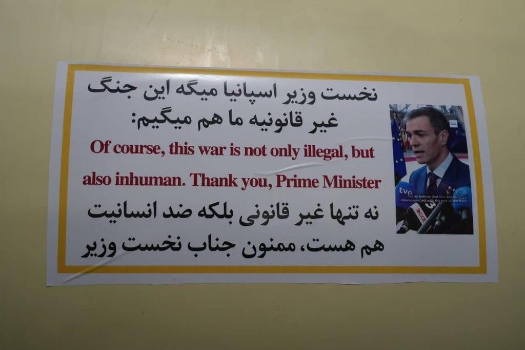 El material fue publicado por la agencia semiestatal Tasnim News Agency, que mantiene estrechos lazos con la Guardia Revolucionaria Islámica. En una de las imágenes, compartidas en su canal de Telegram, se observa un misil con una calcomanía que reproduce en inglés y farsi una declaración de Sánchez durante una cumbre de la Unión Europea en Bruselas: “Por supuesto, esta guerra no solo es ilegal, sino también inhumana”. El mensaje se completa con un “gracias, señor presidente”.