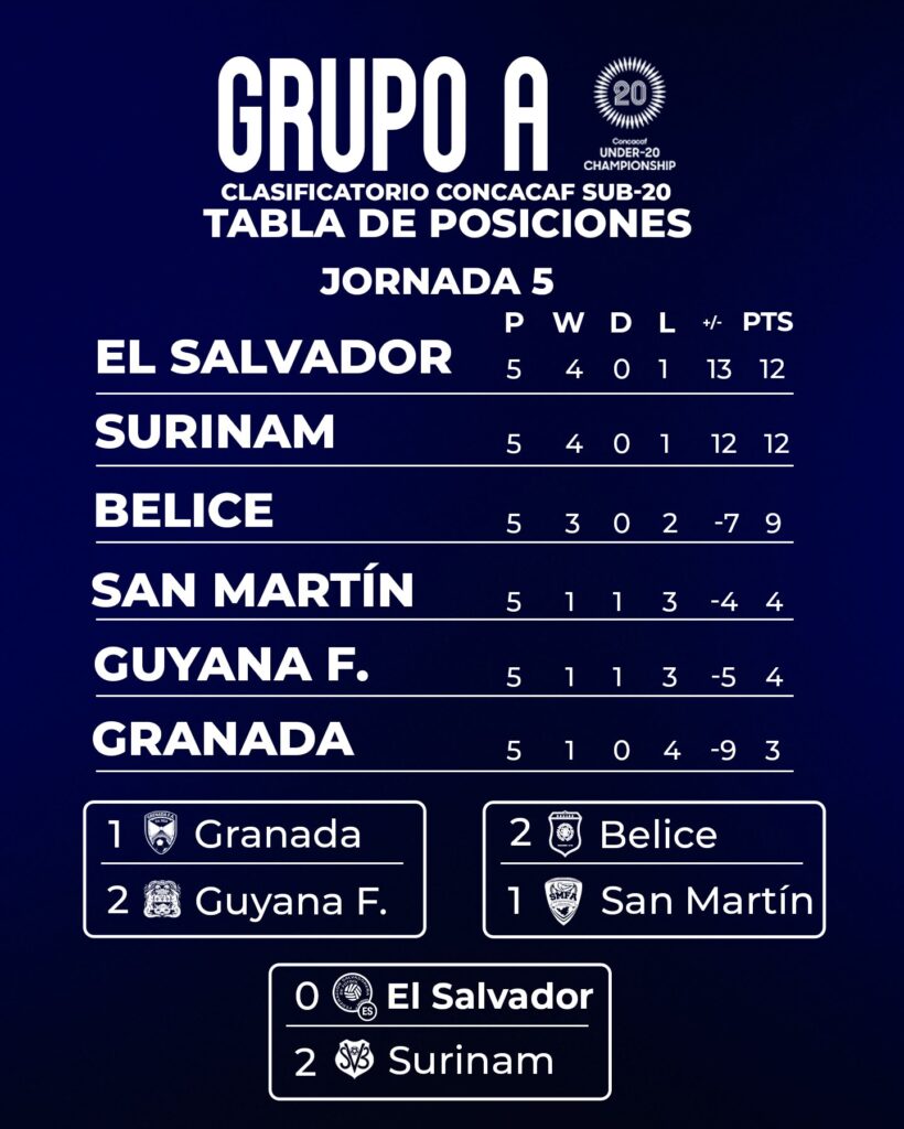 La Selecta sub-20 cayó 2-0 contra Surinam, pero pese a la derrota se clasificaron en primer lugar, tras sumar 12 puntos, en el grupo A, junto a Surinam, Belice, Granada, SanMartín, Guayana Francesa, se clasificó directamente por mejor diferencia de goles (+1), luego de igualar en puntos (12) con Surinam.