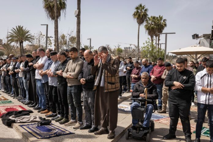 A pocos minutos del mediodía de este viernes, decenas de musulmanes, principalmente hombres, se concentraron a unos 200 metros de la puerta de Damasco, una de las entradas a la Ciudad Vieja de Jerusalén, para rezar en el último viernes del mes de ayuno musulmán. El muecín comenzó la llamada a oración y, bajo el control de la policía israelí, los fieles organizaron como pudieron sus alfombras en el angosto bulevar de la calle Al Anbeya, con la mirada en dirección a Al Aqsa.