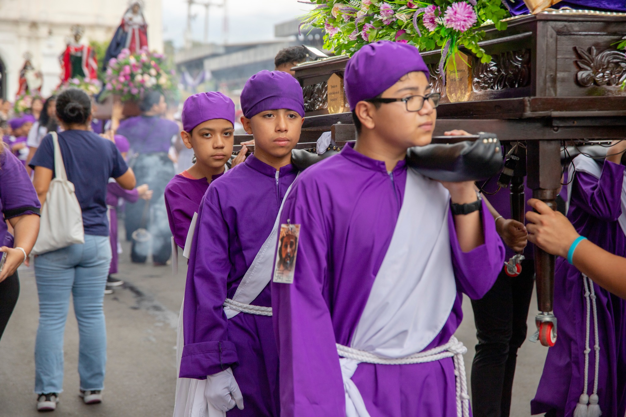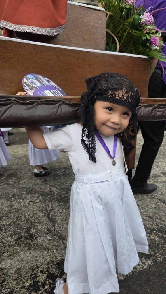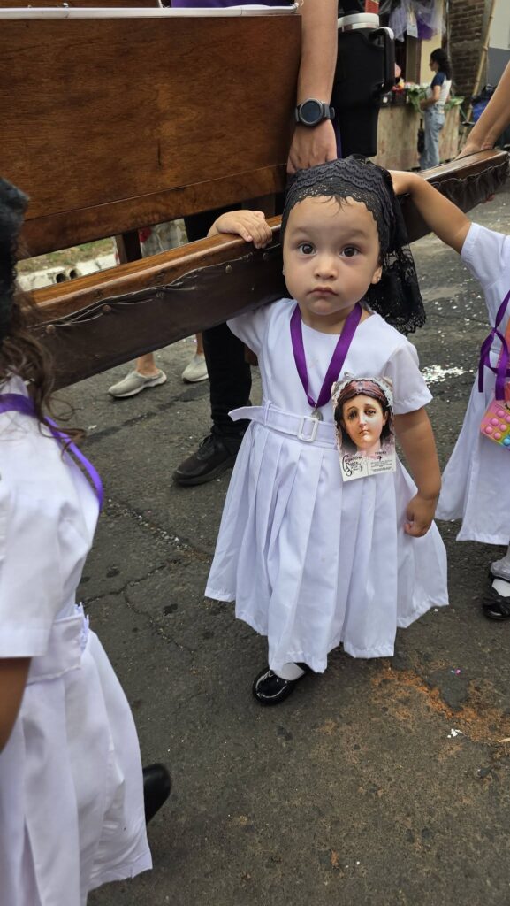La tarde estuvo marcada por la participación de decenas de niñas y niños, quienes, con profundo respeto, llevaron en hombros pequeñas imágenes que representan escenas de la Pasión de Cristo. Vestidos con túnicas moradas y blancas, replicaron con solemnidad las tradiciones que por generaciones han caracterizado a El Salvador durante esta época.