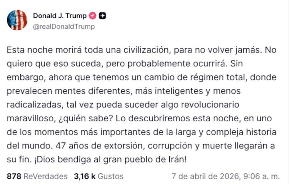 La tensión entre Estados Unidos e Irán alcanzó un nuevo punto crítico luego de que el presidente Donald Trump publicara un mensaje en su red social advirtiendo que “esta noche morirá toda una nación”, en referencia directa a Irán, en medio de un ultimátum que podría definir el rumbo del conflicto bélico en las próximas horas.